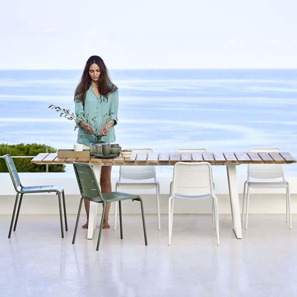 The idea behind the coloured lightweight aluminium chair is that the furniture should be a fresh and casual breath in the often very neutral outdoor furniture universe, - both in respect of colours and the modern and light look. In addition, the furniture occupies less than traditional outdoor furniture and has a good sitting comfort. Copenhagen city chair requires minimal of maintenance and cleaning and has a long lifespan. The chair can be stacked and used both outdoors and indoors. Indoors as a simple kitchen chair or as just a raw modern extra chair in the living room by the dresser or desk. Copenhagen dining chair is made of powder coated aluminium, is weather resistant and manufactured both with and without armrests.