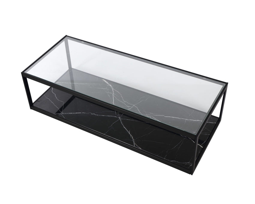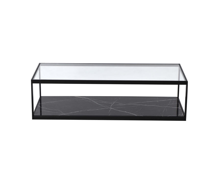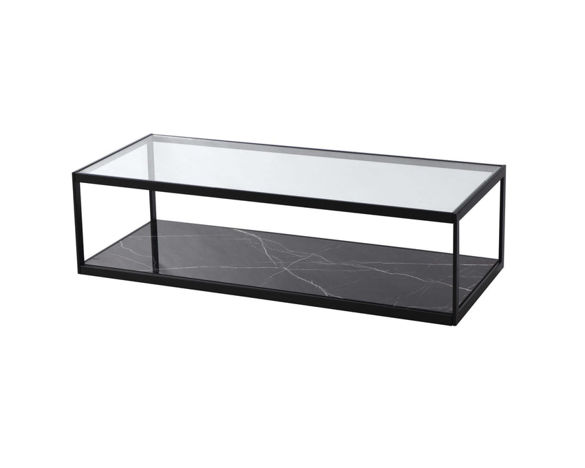 Featuring a minimalist design, the rectangular Tamon Coffee Table boasts a clear glass top and black marble base with a simplistic matt black frame. The Tamon provides a striking contrast to any interior.
