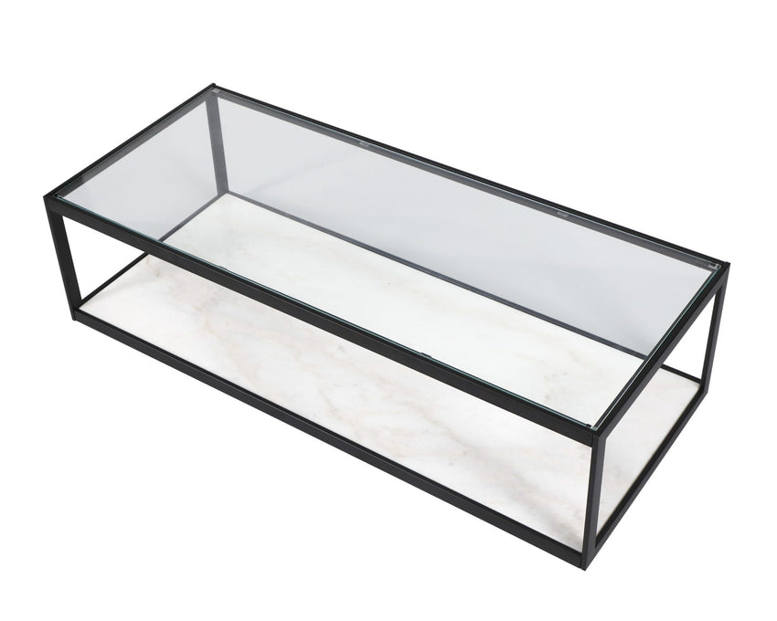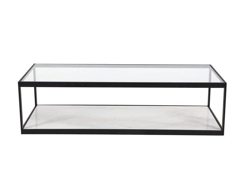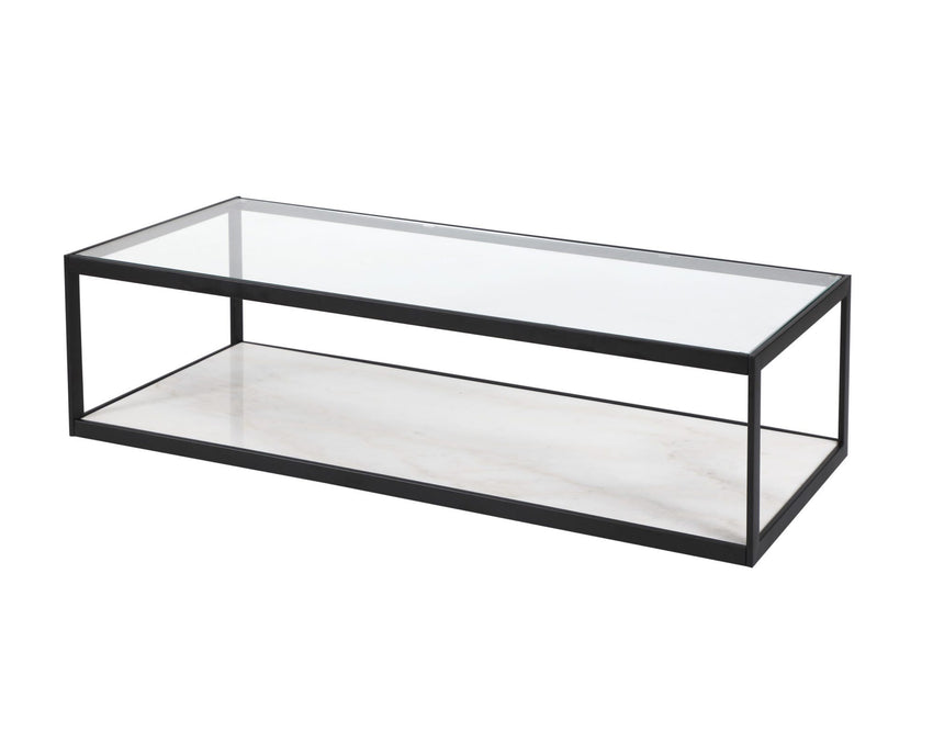 Featuring a minimalist design, the rectangular Tamon Coffee Table boasts a clear glass top and white marble base with a simplistic matt black frame. The Tamon provides a striking contrast to any interior.