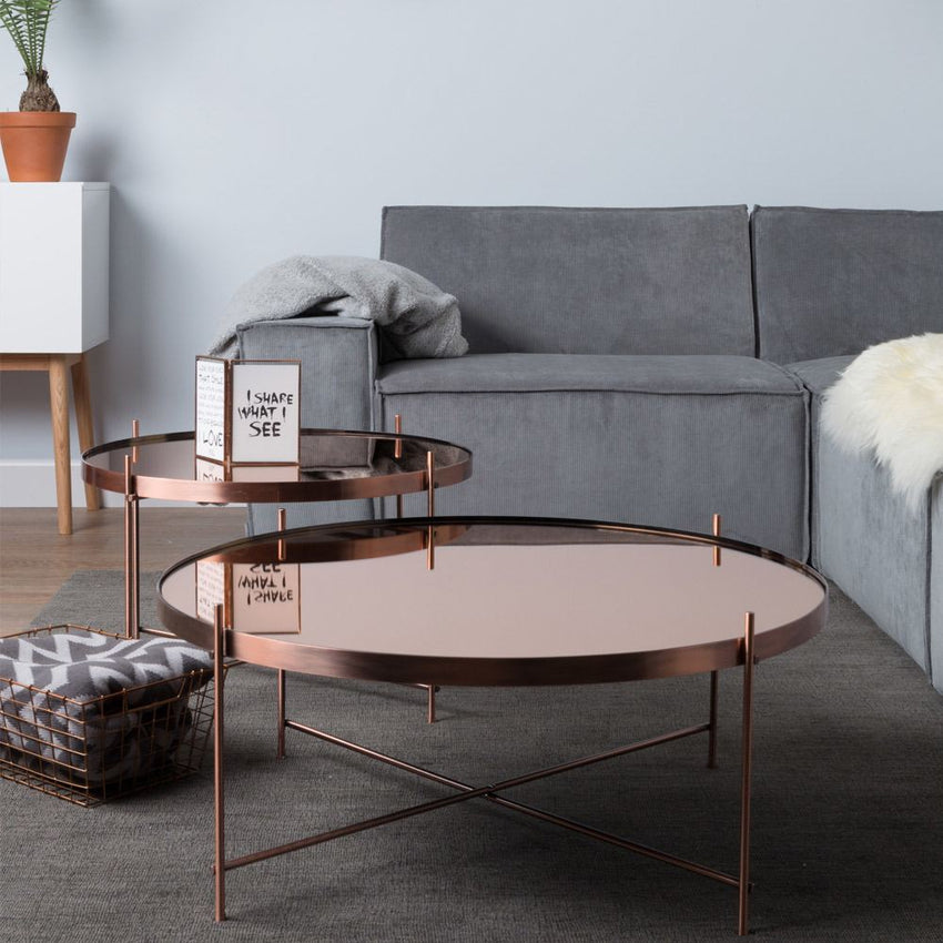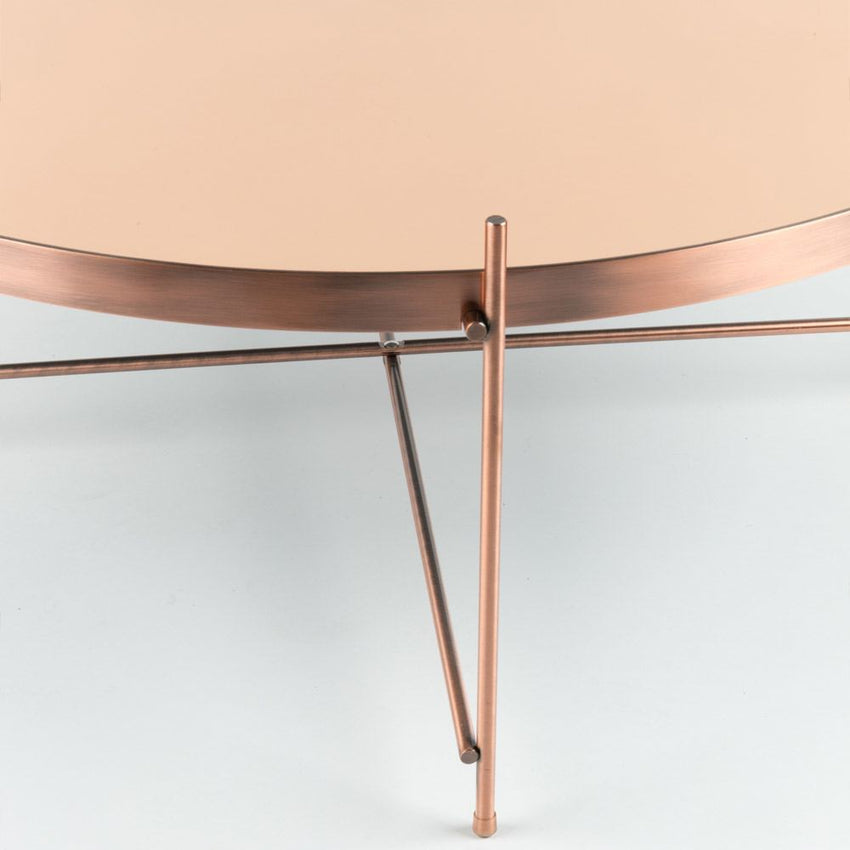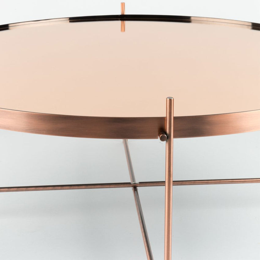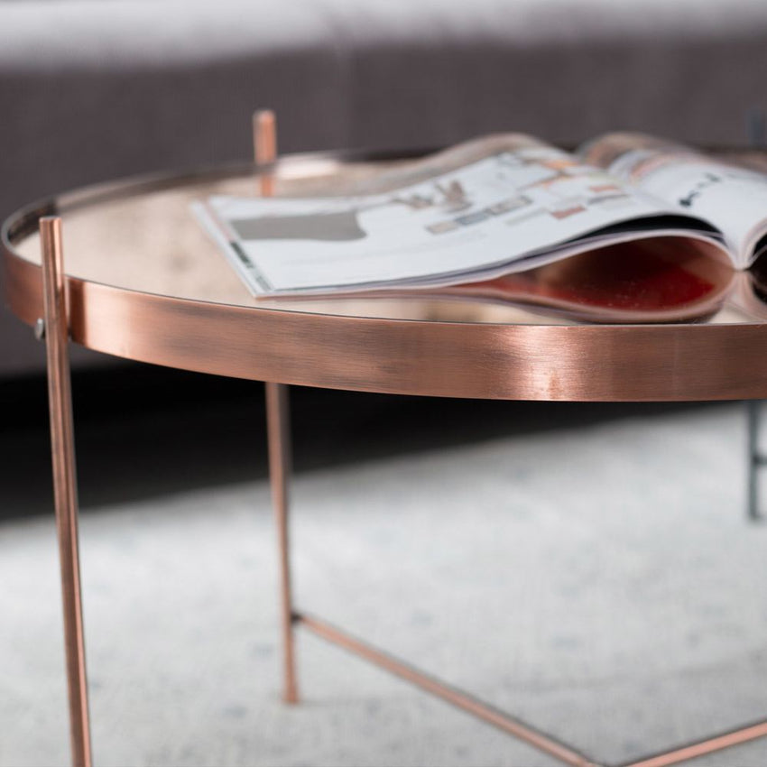 With folding steel base and glass table top, this collection is presented in a choice of copper plated with mirrored glass or black powder coated iron with tempered glass configurations.