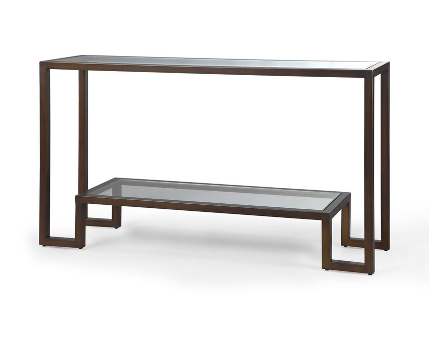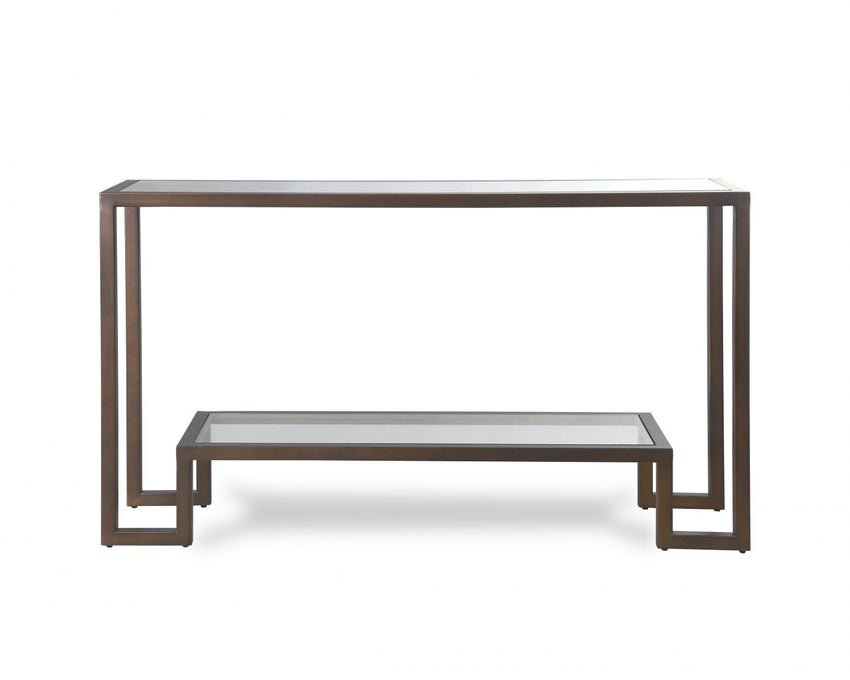 Clear Toughened Glass Top and Shelf Antique Bronze Coated Steel Frame and Legs Metal items are intended to have a rustic appearance that may include spotting and variances in tone and lustre.