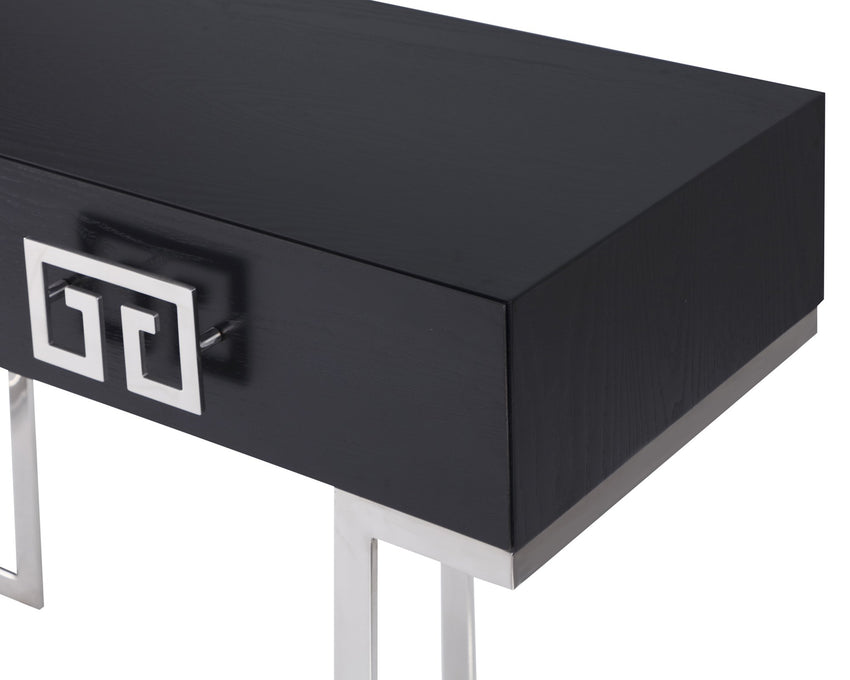 Black Ash Veneer Top Polished Stainless Steel Legs and Handles Handles are 100% hand-made item in metal. Each piece has different small variations and hand made related finishes including small welding points at junctions and not being completely straight, square or flush. These are the characteristic of the hand-made item and it is not a defect.