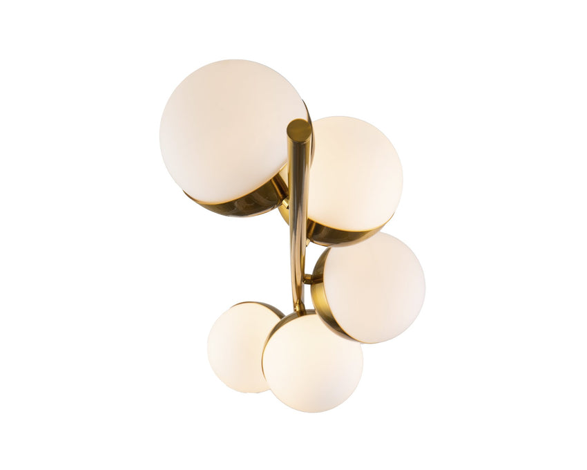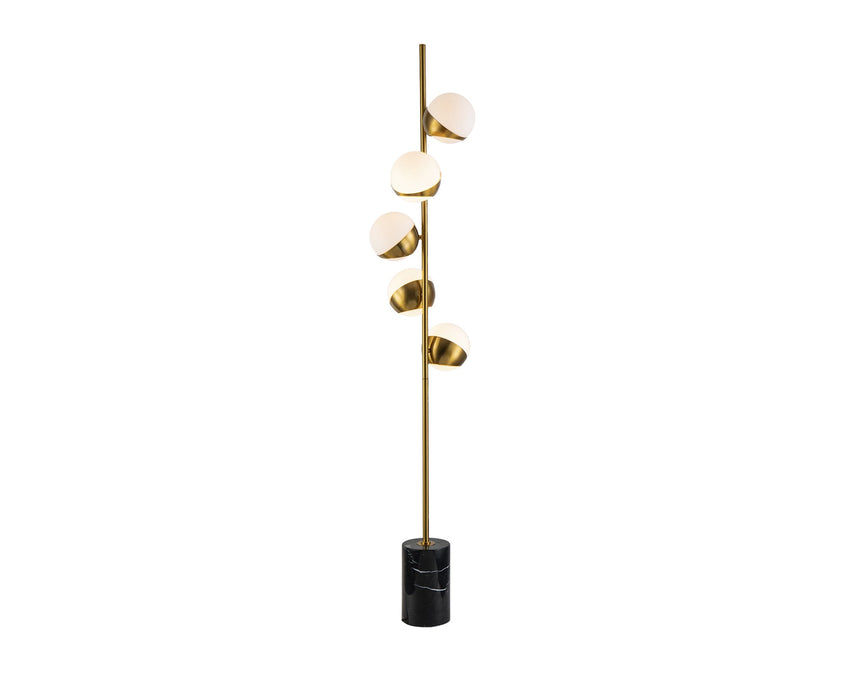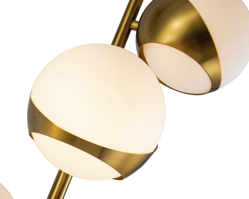 Enjoy the ambient illumination provided by the Globus Floor Lamp. A lesson in luxury design, the Globus features a slender metal frame and five stunning spheres of white and brass bound glass.(Light bulbs not Included) Requires 5 x E14 MAX 40W