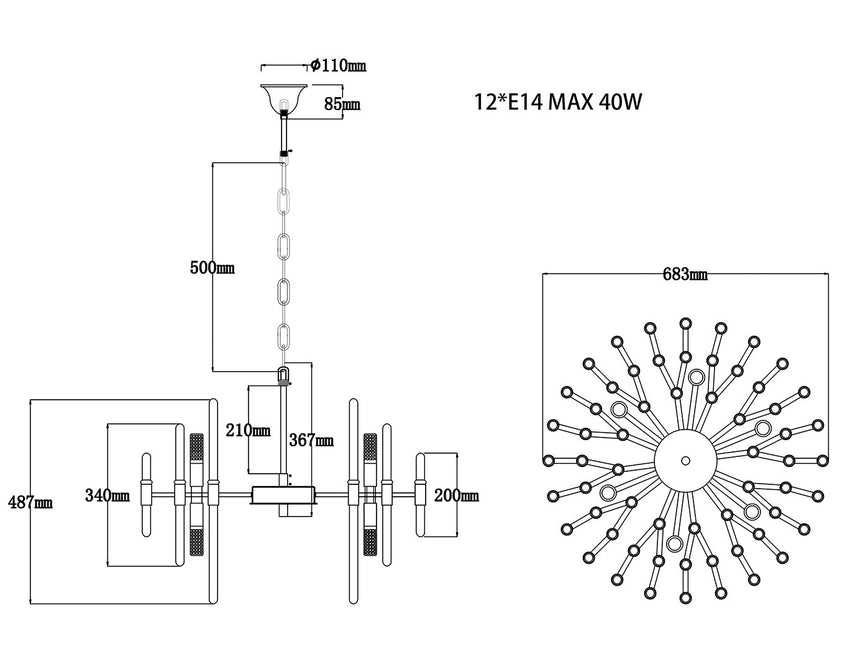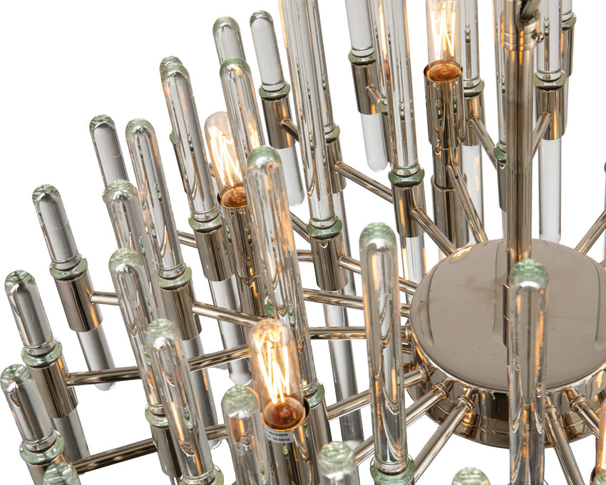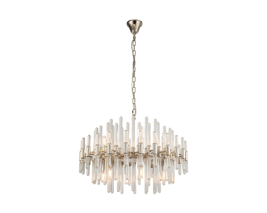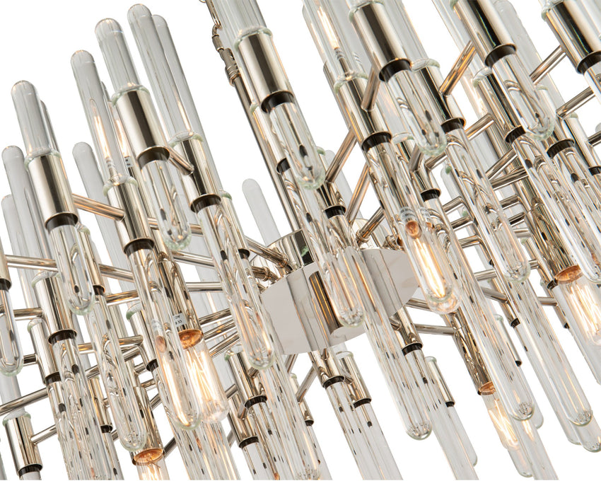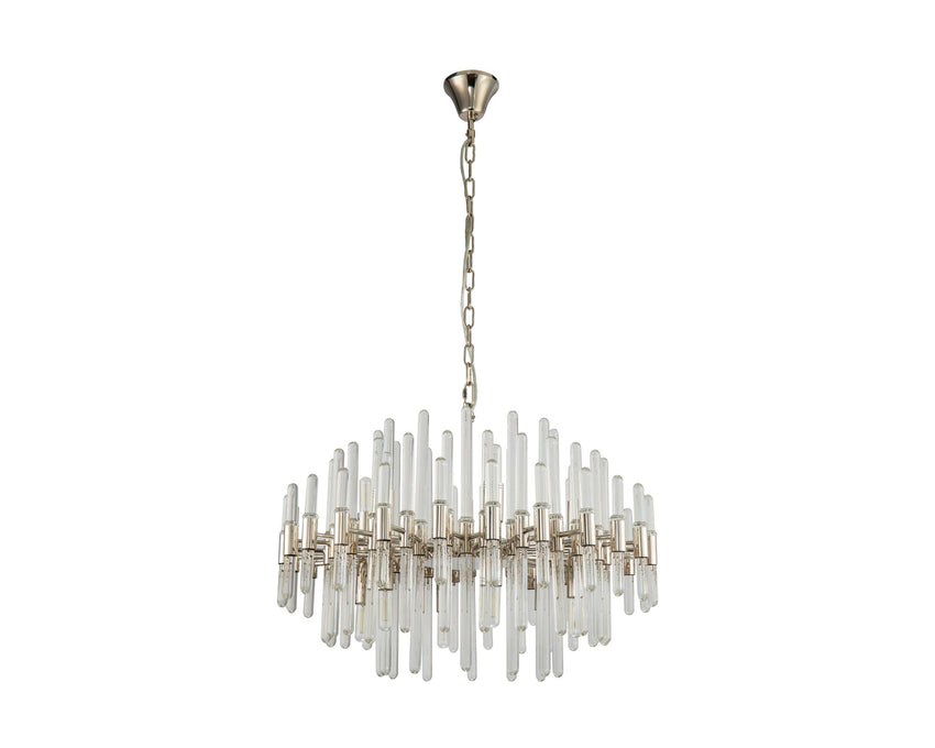 Designed to be the focal point of any interior space the Durham Ceiling light will create a sense of grandeur for all visitors. Constructed using test tube type style clear glass and boasting a stunning nickel finish, the Durham can be suspended from any ceiling within the hallway, lounge or stairwell for the ultimate wow factor. Light bulb is not included. Requires 12 x E14 MAX 40W.