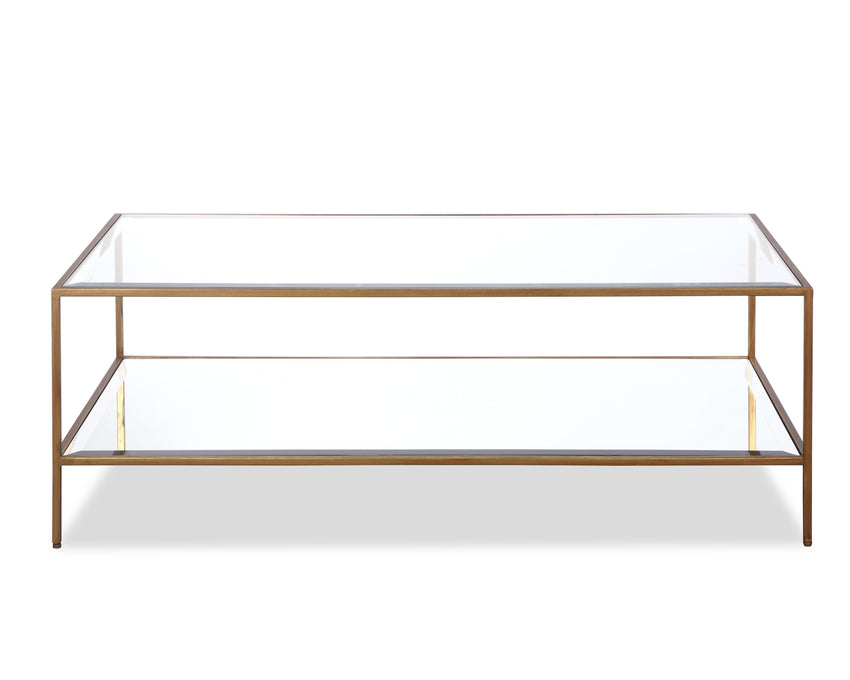 Clear Toughened Glass Top. Mirror Bottom Shelf. Antique Gold Coated Steel Frame and Legs. Metal items are intended to have a rustic appearance that may include spotting and variances in tone and lustre.