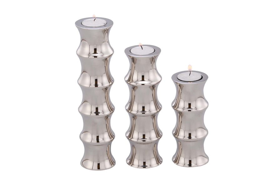 Boasting a minimalist design that resembles bamboo, these T-Light holders are crafted from aluminium and finished with nickel plating.