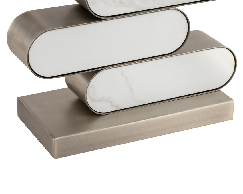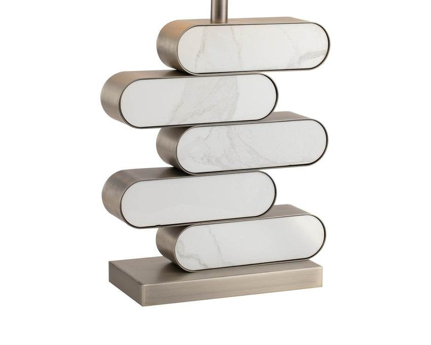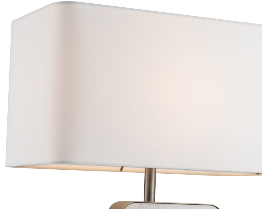 Metal bronze with white marble, White linen shade with white colour inside. Light bulbs are not included. Requires E27/E14 screw cap bulb.