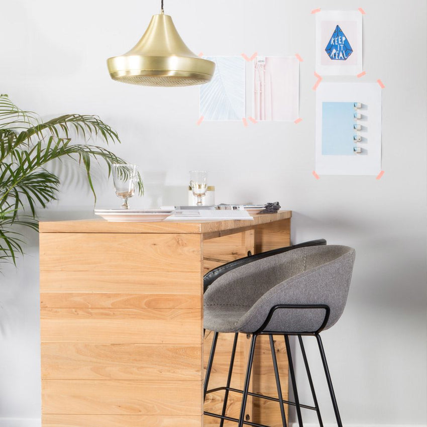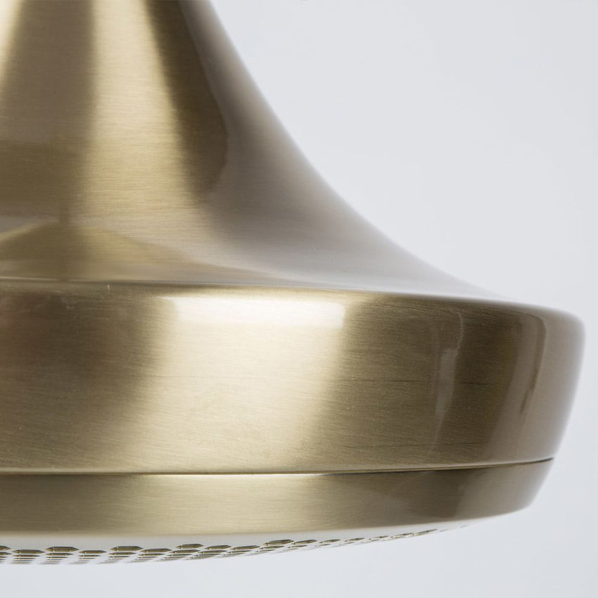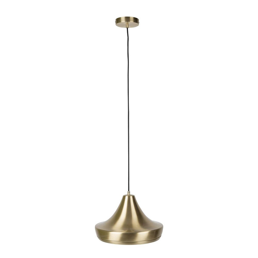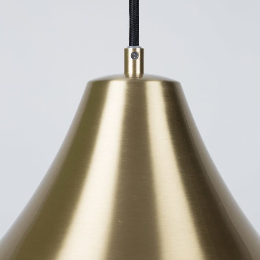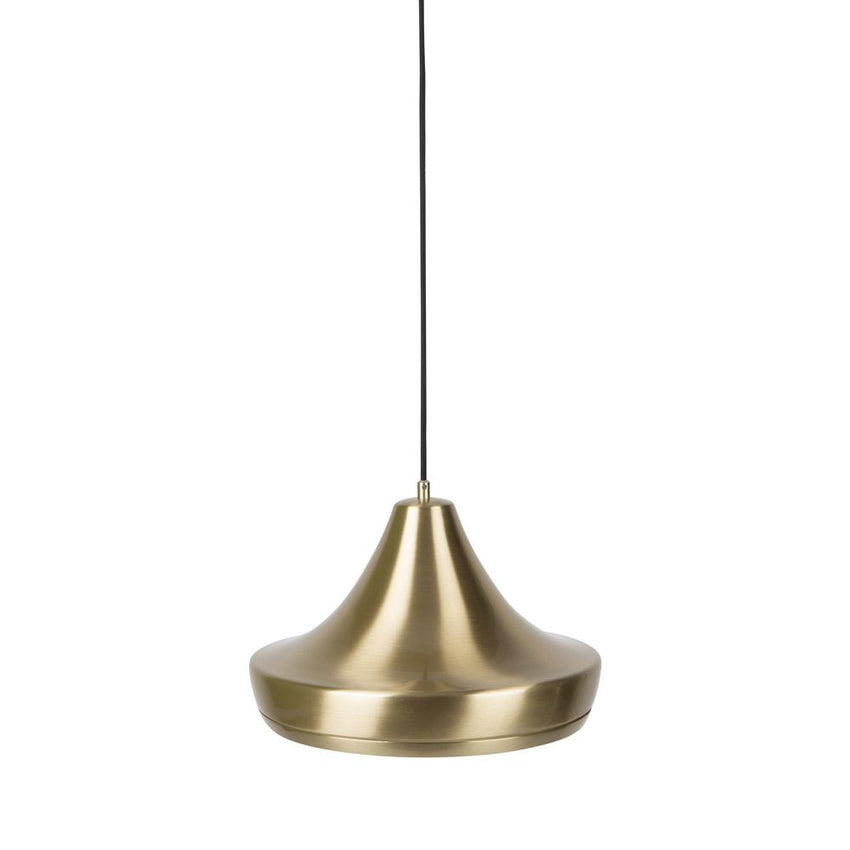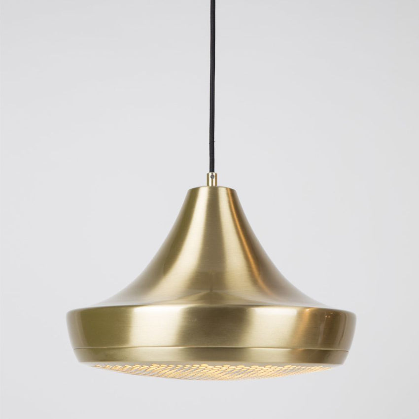 Inspired by industrial salt shakers, this brass plated metal pendant lamp exudes designer appeal.