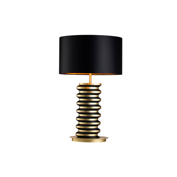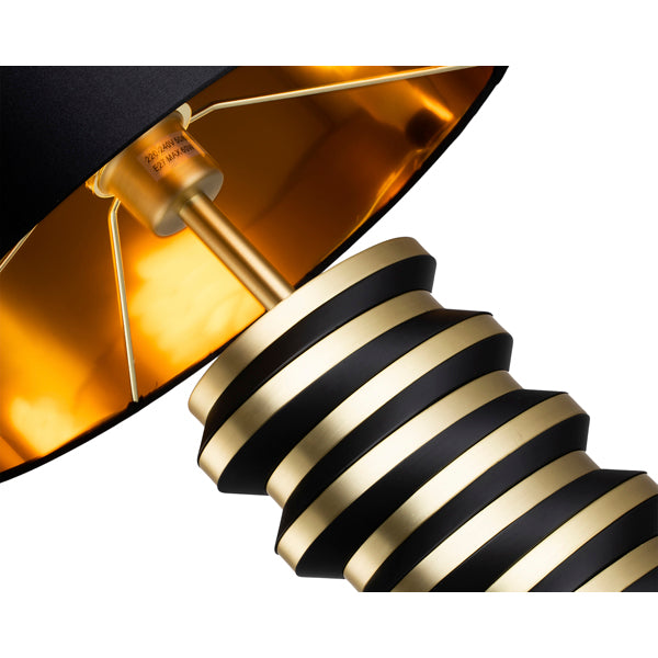 Brushed Brass Finish, Matt Black Accents, Black Fabric Shade with Gold Interior