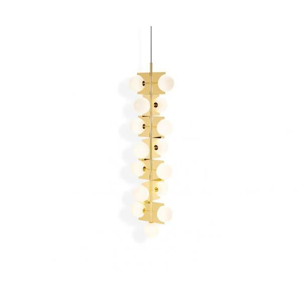 A brass-plated statement drop chandelier comprising of 15 double-layered white glass spheres distributed seven rotating planes. This space-filling chandelier creates a dramatic feature in any staircase, lobby, atriums or high-ceilinged environments.