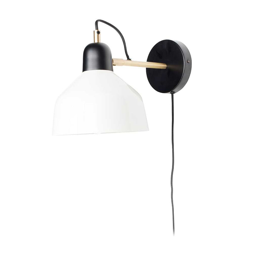 An antique brass arm adds to the contemporary elegance and offers a welcome counterpoint to the glossy white metal shade.