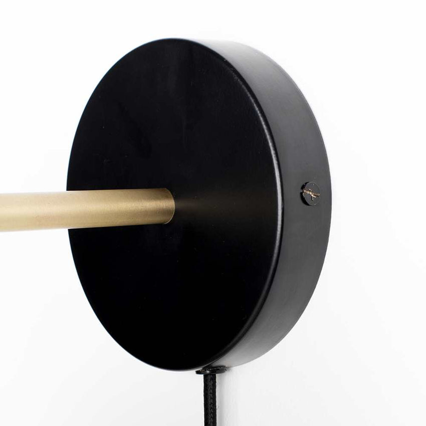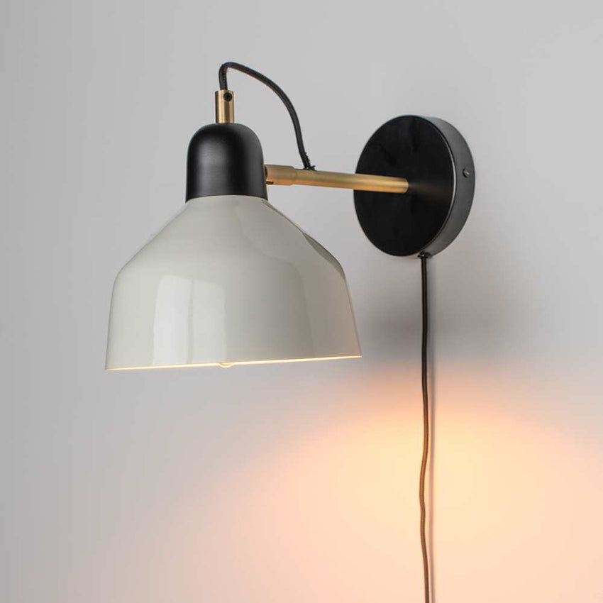 Sleek iron wall lamp with a monochromatic design and antique brass fixings.